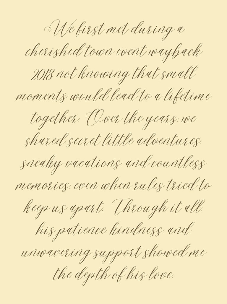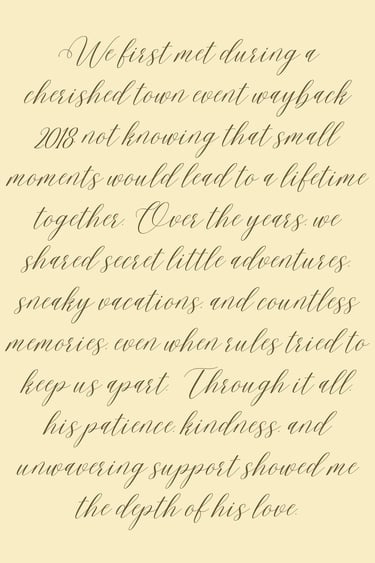 We first met during a cherished town event way back 2018, not knowing that small moments would lead to a lifetime together. Over the years, we shared secret little adventures, sneaky vacations, and countless memories, even when rules tried to keep us apart. Through it all, his patience, kindness, and unwavering support showed me the depth of his love.